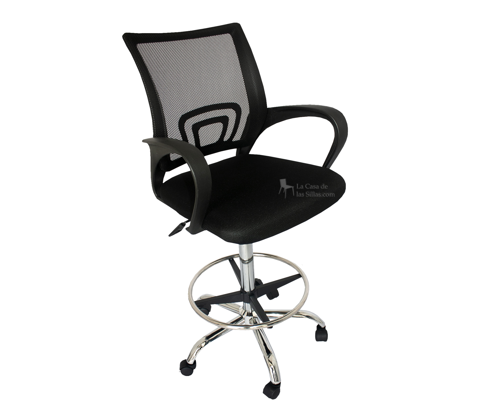Descripción: Trendy Cajero - Asiento y espaldar acolchado en tela mesh. -Apoya brazos fijos y apoya pies metal cromado. - Base Cromada de 5 puntas con ruedas -Sistema de elevación neumática. -Altura mínima 60 cm -Altura máxima 80 cm