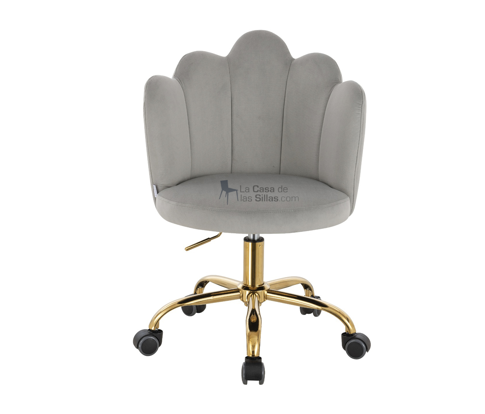 Descripción: CLARISSA GOLD GRIS – Asiento y espaldar acolchado - Tapizado en piel de durazno – Base dorada de 5 puntas con ruedas -Sistema de elevación neumática.Todas nuestras sillas están fabricadas con materiales resistentes y duraderos, cumpliendo con estándares de seguridad y ergonomía.