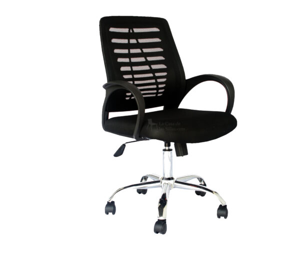 Descripción: Silla Ejecutiva Dinamic. - Espaldar elaborado en malla. - Asiento de tela mesh. - Apoya brazos de Nylon de alta densidad. - Sistemas: Elevación neumática y basculante. - Base Cromada de 5 puntas con ruedas. - Soporte Lumbar