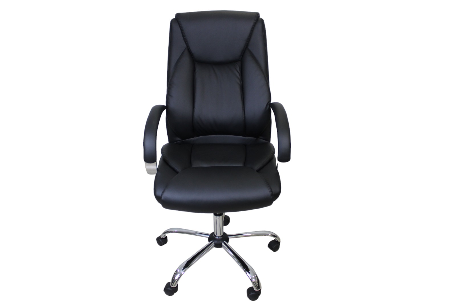 Descripción: Silla Presidencial Suiza – Silla elaborada en BiPiel. – Brazos de metal cromado re-vestido en bipiel acolchado. – Base Cromada de 5 puntas con ruedas – Soporte Cervical y Soporte Lumbar – Sistema basculante. – Sistema de elevación neumática