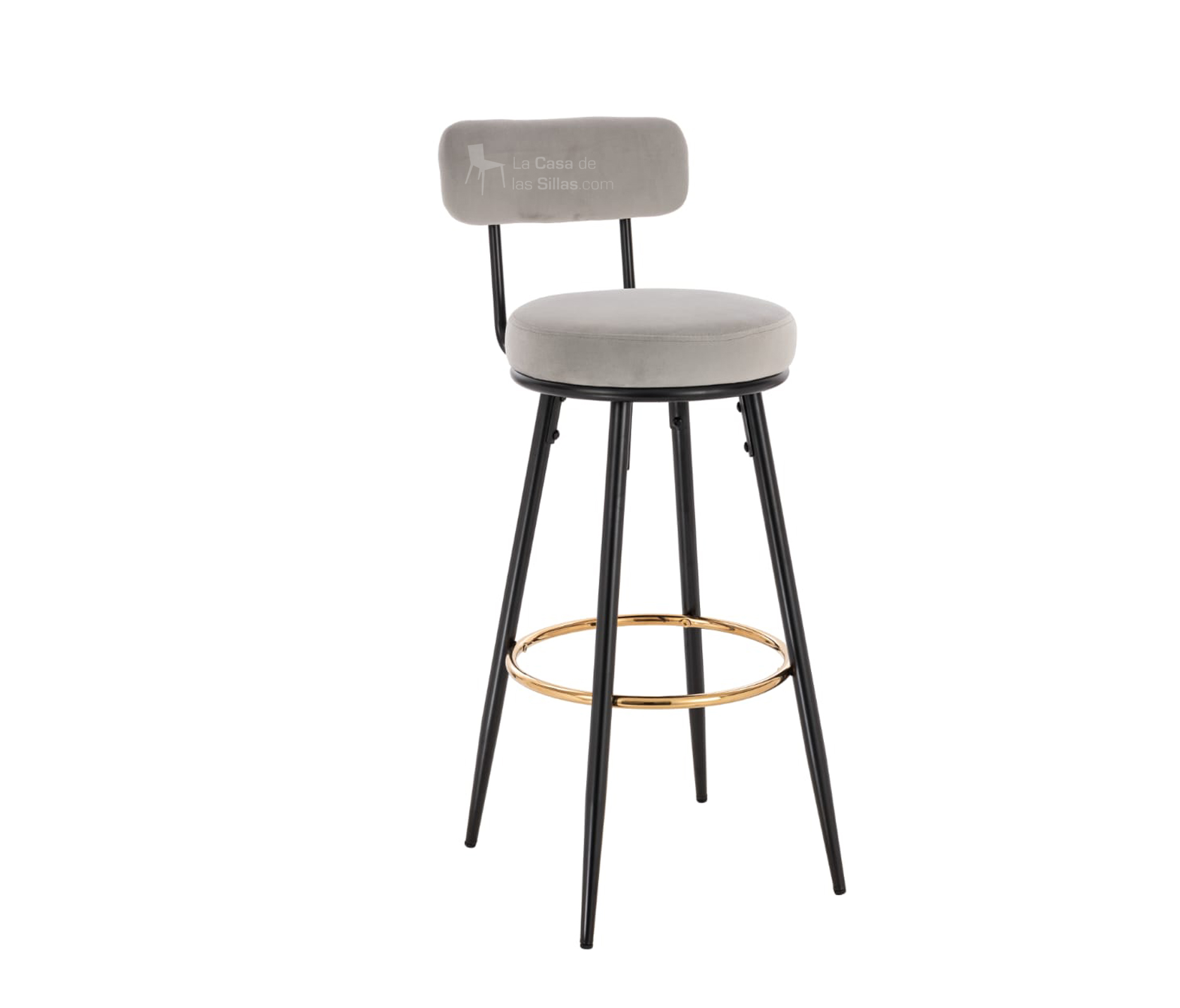 Descripción:  HARY-Elegante Diseño -Asiento giratorio acolchado en gamuza -Estructura de metal negro -Posa pies dorado -Altura: 75cm